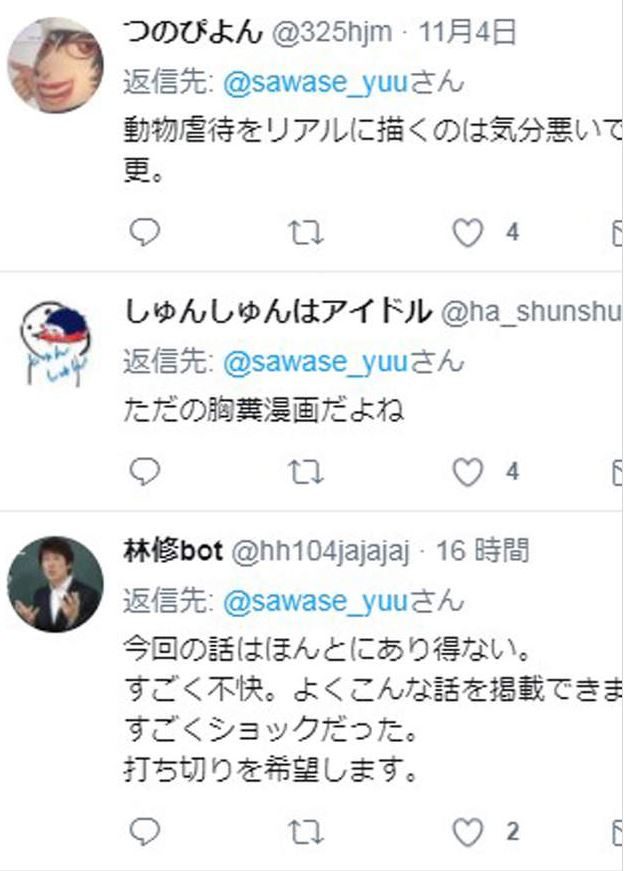 ▼網友們都覺得這一情節太殘忍,紛紛在兩位作者的推特下留言,說:「這是虐待動物」、「噁心」、「作者精神有問題」。