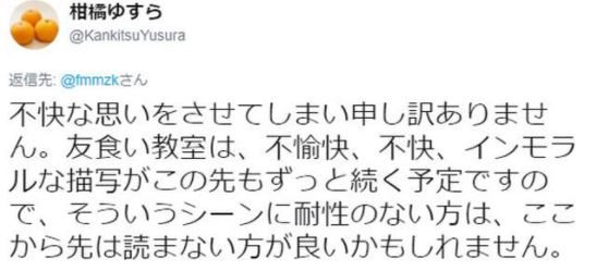 ▼負責編劇的柑橘ゆすら更是直接回嗆網友:「對不起讓大家不舒服了,但以後還會有更多不舒服的情節,接受不了就不要看。」