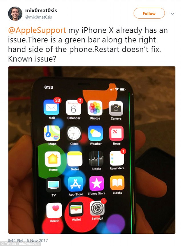 ▼美國、加拿大、波蘭、澳洲的很多64GB、256GB用戶反映了這一問題。還有用戶說,自己買回iPhone X只用了一天,綠線就出現了。