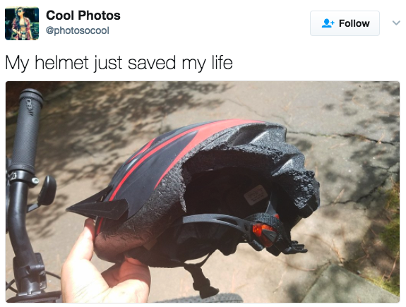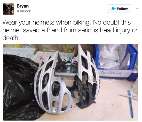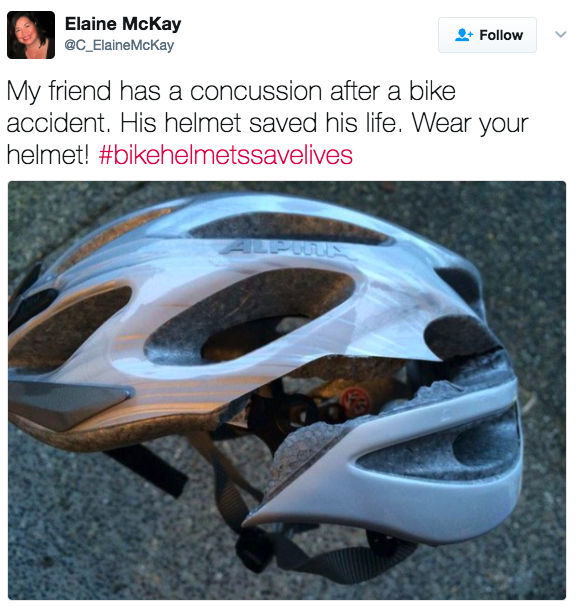 ▼「騎腳踏車時一定要戴安全帽。毫無疑問,這個安全帽幫我朋友免於重傷,甚至死亡。」