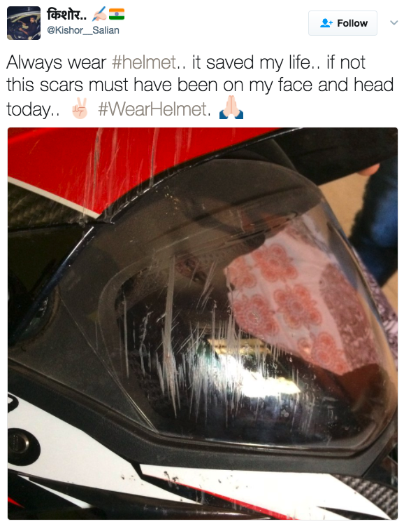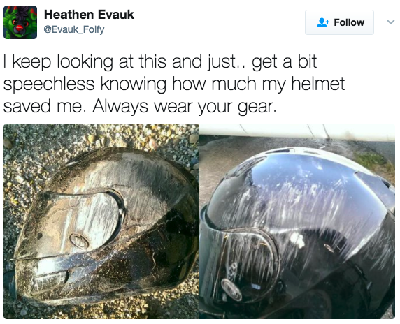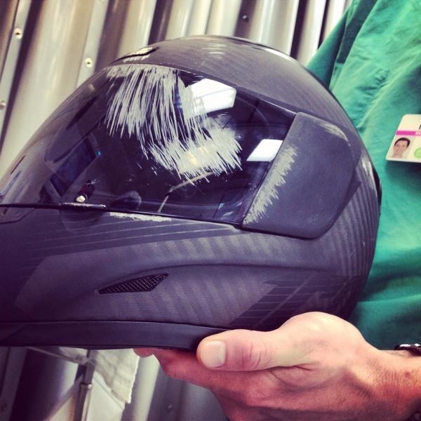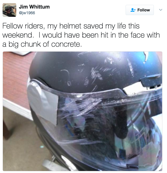 ▼「各位騎車的朋友,這個週末我的安全帽救了我,否則我的臉就直接撞到混凝土上去了。」