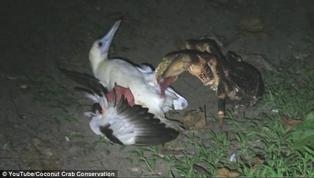 ▼Mark表示,當地的椰子蟹會爬到樹上,突襲在鳥巢中熟睡的海鷗。牠先用鉗折斷海鷗的一隻翅膀,然後把海鷗拖到沙灘上。海鷗飛不起來,拼命揮動翅膀反抗,還用喙猛啄椰子蟹,但還是無法逃脫。最後又有幾隻椰子蟹爬過來,將海鷗分屍吃掉。