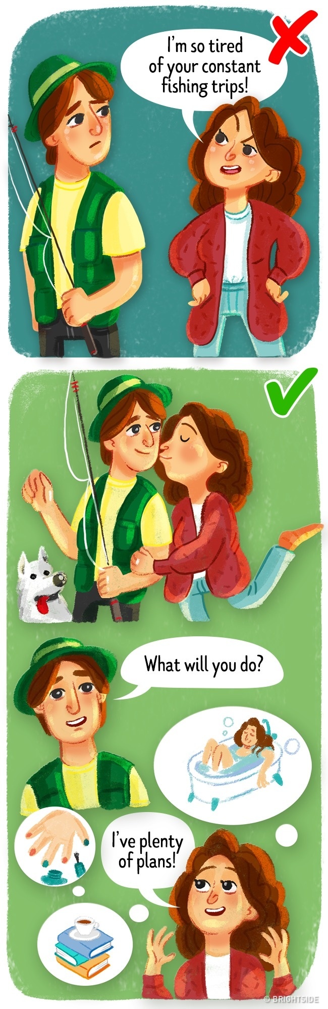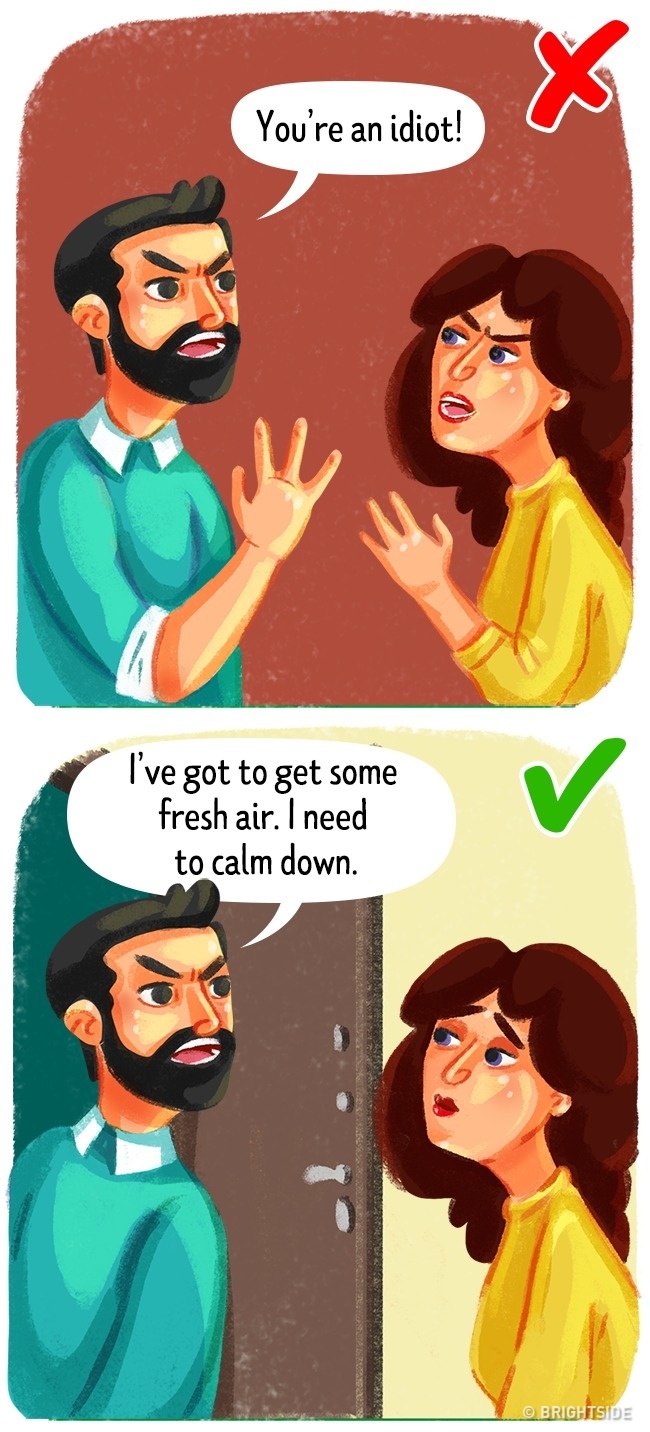 ▼控制情緒:你可以發脾氣,但不能侮辱對方。感覺自己控制不住時,深吸口氣,然後出去散步。不要冷戰,也不要口出惡言,冷靜下來後再談。