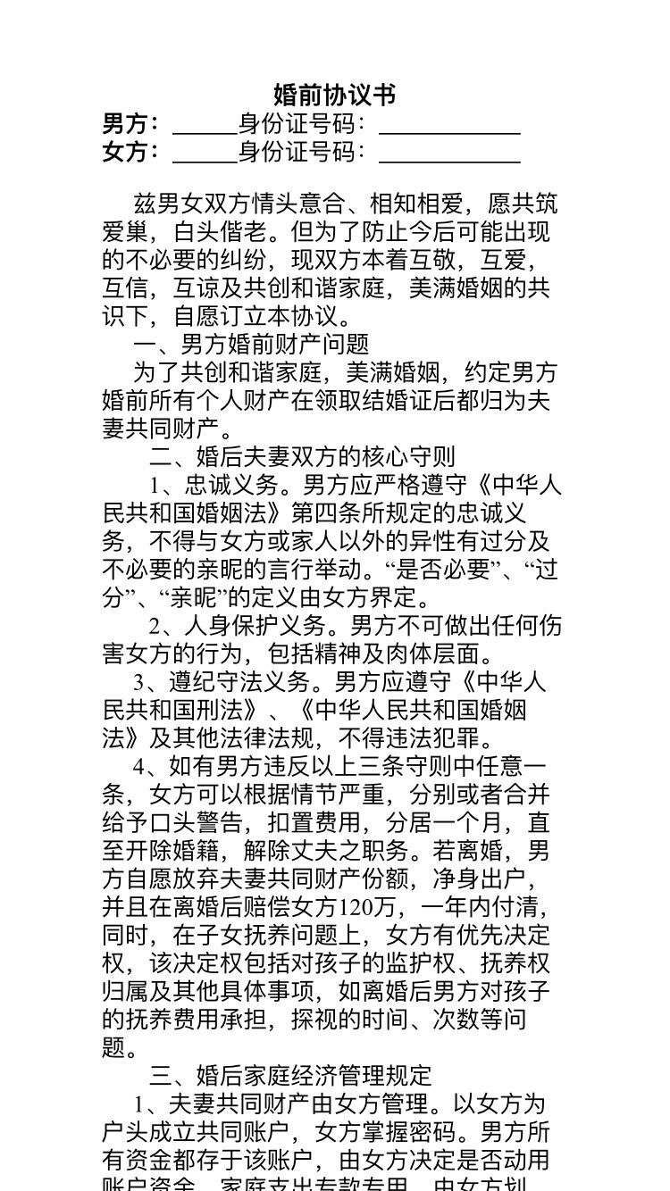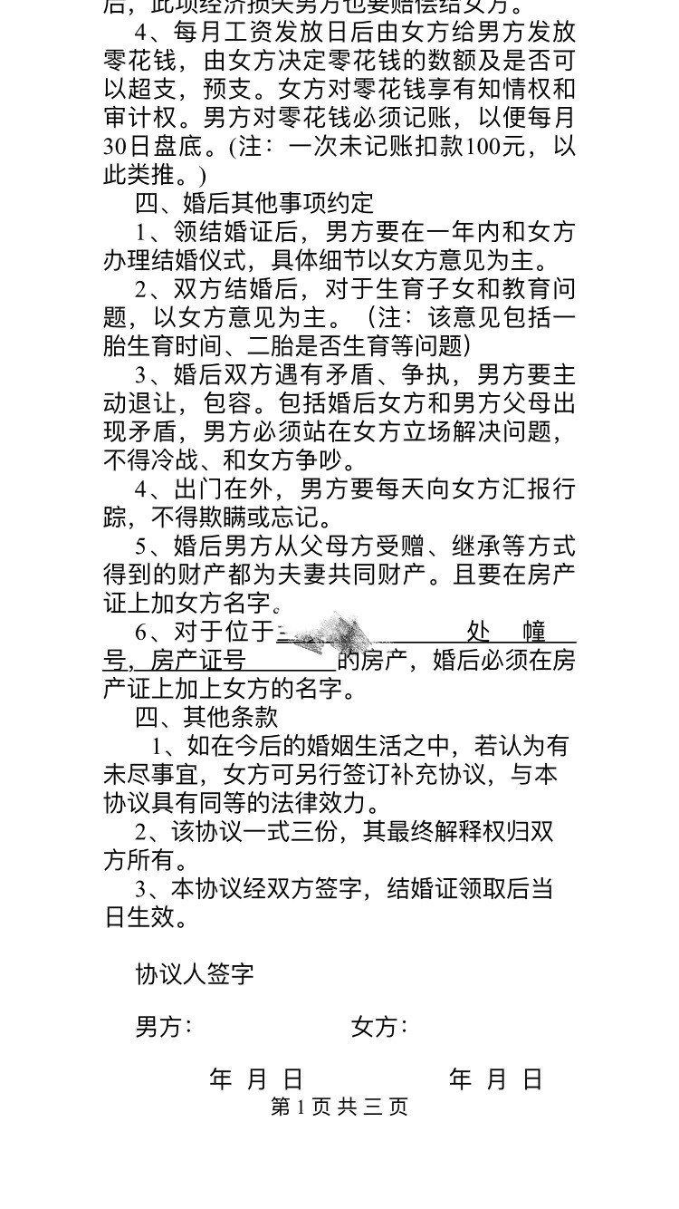 ▼這份據悉是由就讀法律系的新娘閨蜜為她所「量身定做」的婚前協議,密密麻麻的共有5大規定和18條小規定,僅文字就長達3頁。裡面的內容包括:「約定男方婚前所有個人財產在領取結婚證後都歸為夫妻共同財產」、「每月工資發放日後由女方給男方發放零用錢,由女方決定零用錢的數額及是否可以超支,預支」、「婚後男方從父母方受贈、繼承等方式得到的財產都為夫妻共同財產。且要在房產證上加女方名字」、「夫妻共同財產由女方管理,由女方成立共同帳戶,女方掌握密碼。男方所有資金都存於該帳戶。」等不平等條約。