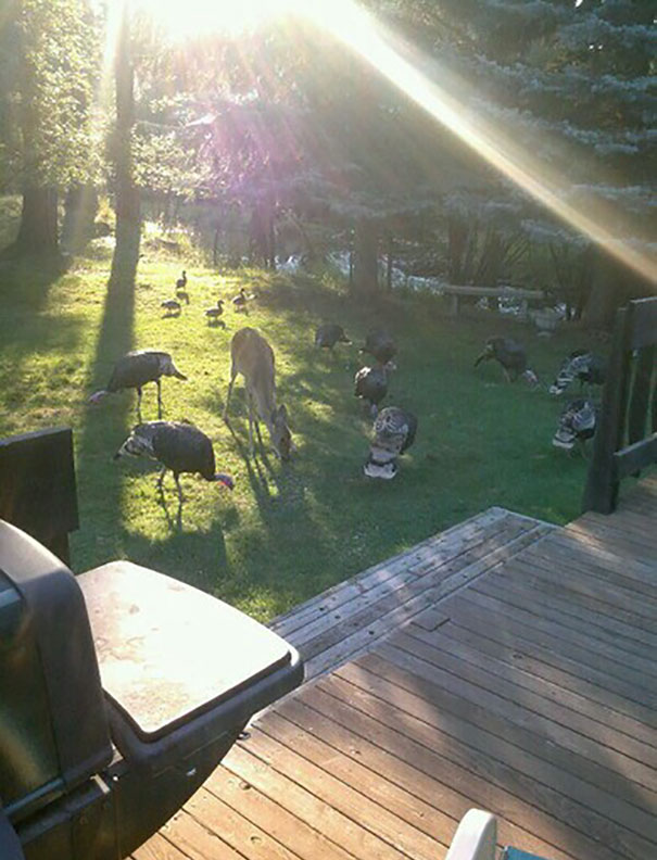 ▼7. 「醒來後就看到了這個,一隻狐狸媽媽和牠的小狐狸們在我家後院玩。」