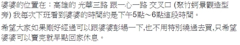 ▼女網友為了瞭解婆婆處境,上PTT查詢,才知道婆婆的丈夫腳有問題,但家裡沒車,無法轉診,經濟狀況比較拮据。想到婆婆在雨中賣飲料的場景,讓她相當不捨,決定PO出婆婆賣飲料的時間和地點,希望順路的網友可以過去捧場。