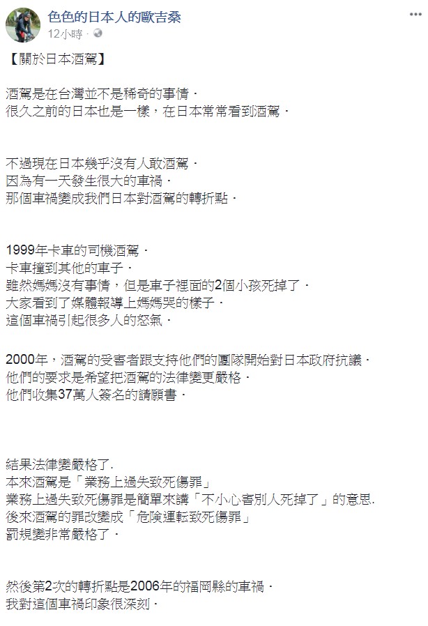 ▼原來在日本以前也曾經是酒駕事件頻傳,造成不少的傷亡。但有兩件關鍵事件發生,導致民眾促立法案。而使現在日本的酒駕事件大幅減少。這兩個事件分別發生在1999年及2006年,導致日本社會氛圍群起立法,要求改善。