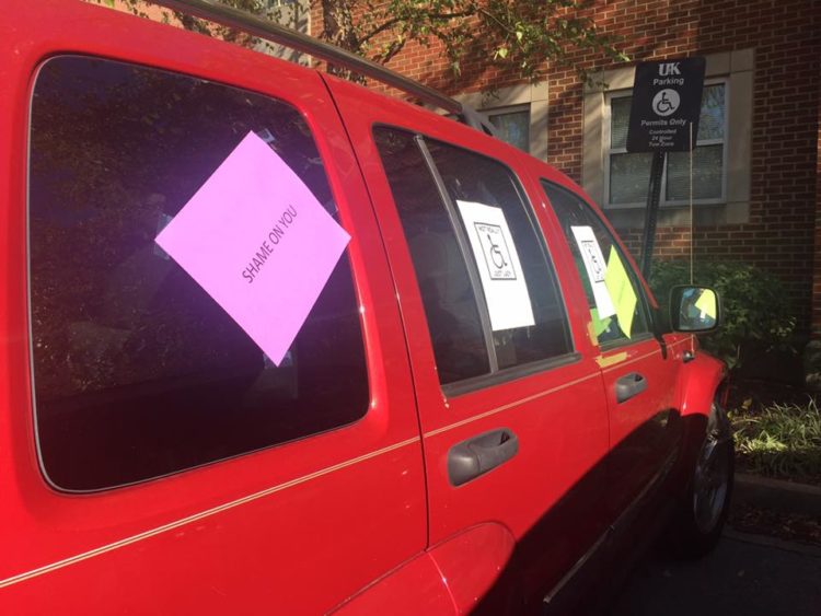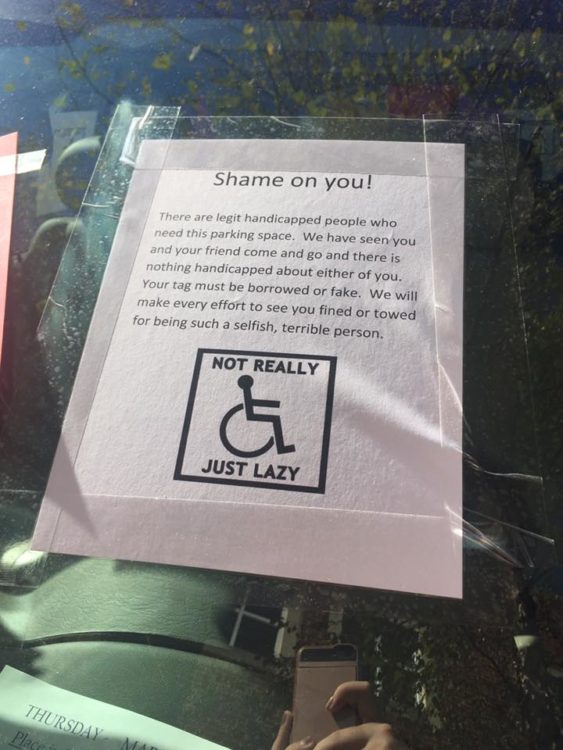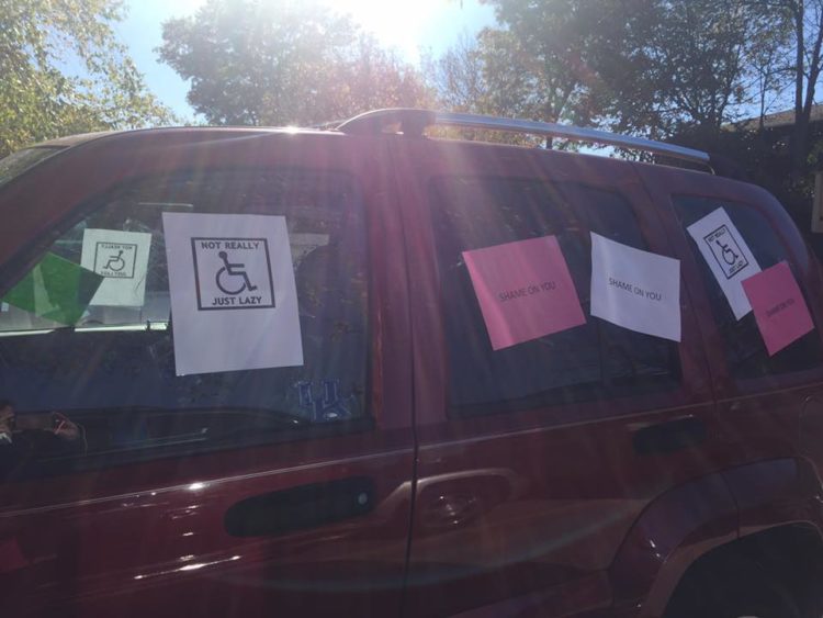 2017年11月19日美國肯塔基州的學生蕾西(Lexi Baskin)最近分享了一個引起社會議論的事件,她將車停在身障停車位上,卻被有心人士貼紙條謾罵,她無奈在臉書上暴露自己有腦癌事實,也呼籲大眾注意身障人士的隱性需求。