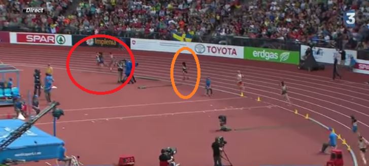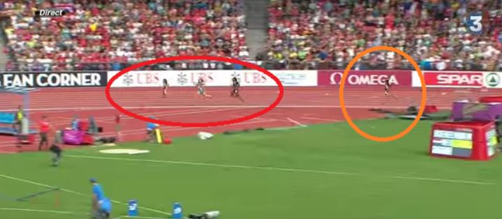▼現在已經是最後一棒,可以看到中間跑道的法國選手,暫居第四。就是橘色圈圈中的這位。