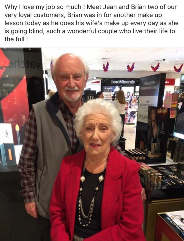 ▼彩妝師PO文說:「這就是我喜歡我的工作的原因!Jean和Brian是我們櫃上的忠實顧客,Brian今天特地來上彩妝課,因為Jean眼睛逐漸失明,他每天都會幫妻子化妝,這對可愛的夫妻很認真在過生活!」