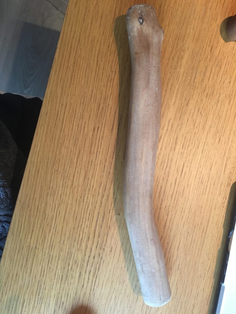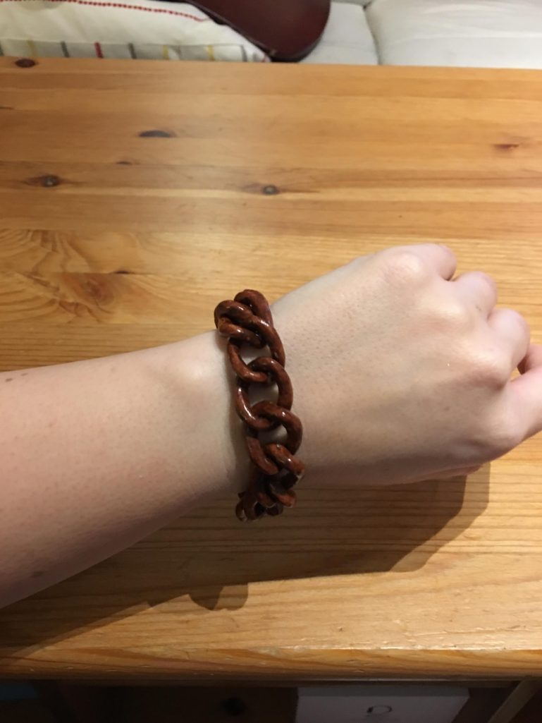 ▼老公將一根木頭削成手鍊,送給老婆當禮物。
