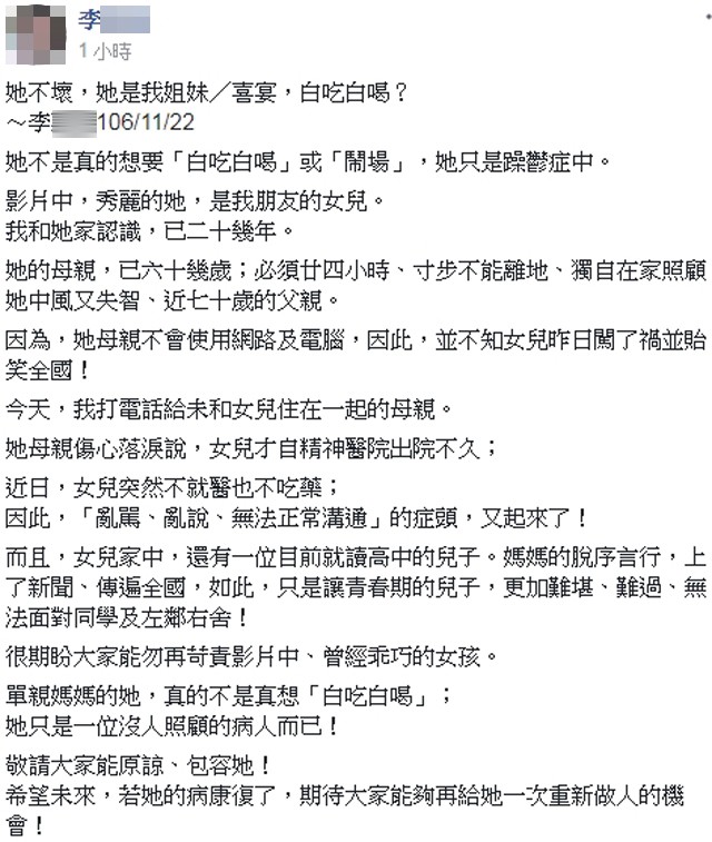 「很期盼大家能勿再苛責影片中、曾經乖巧的女孩。單親媽媽的她,真的不是真想『白吃白喝』,她只是一位沒人照顧的病人而已!」李姓女子說,希望大家能包容忍讓,等到吳女的病情康復,「再給她一次重新做人的機會!」