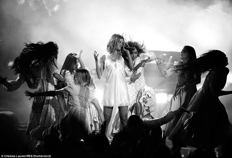 ▼那天她穿著性感白色睡衣演唱「Wolves」,身上的特別化妝看起來就像受傷了一樣。