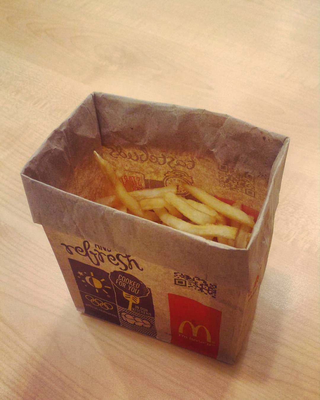 2017年11月24日麥當勞的外帶紙袋很常見,但你知道它的超強用處嗎?前幾天,一名網友在Dcard發文,分享了自己的經驗:「吃薯條撈薯條紙盒,常常弄到滿手都是鹽巴與油,或是薯條、鹽巴掉滿地;而番茄醬則是在移動,或是沒有桌面時難以使用。以上種種問題的解決方法,你只需要改變薯條的承載容器:一個外帶的紙袋即可。」