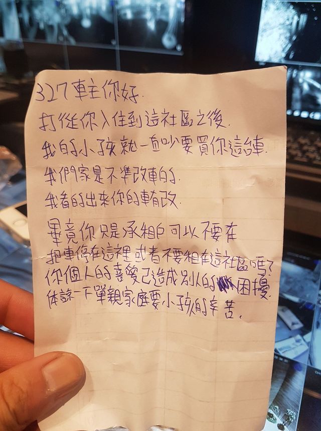▼鄰居媽媽寫說:「打從你入住這個社區之後,我的小孩就一直吵要買你這台車,我們家是不准改車的,我看得出來你的車有改!」她希望對方能夠遷走,還補充:「你個人的喜愛已造成別人的困擾,體諒一下單親家庭要小孩的辛苦。」