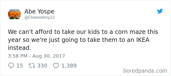 ▼18.「今年我們沒錢讓小孩去玩玉米迷宮,所以我們帶他們去IKEA玩。」