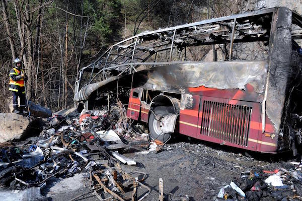 ▼巴士撞上石牆後,納山整個被拋飛離開座位,起身時發現巴士已經起火,而乘客們正在倉皇逃生。乘客們都下車後,巴士就燃起熊熊火焰,瞬間被火焰吞噬。50多名乘客雖然有輕重傷,卻都沒人死亡,僅有馬瑞斯喪生。