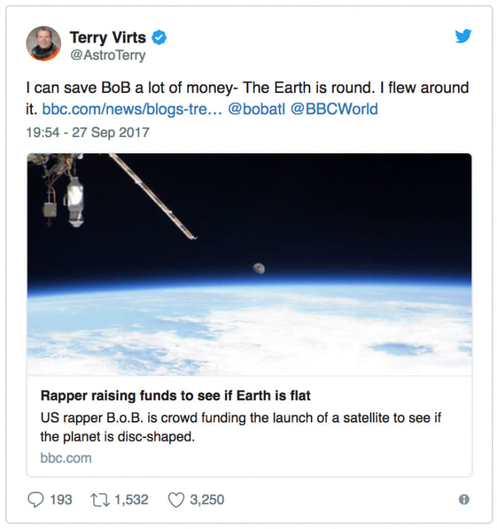 ▼美國NASA太空人Terry Virts直接回應他:「我可以為BoB省點錢,地球真的是圓的,因為我飛去過。」