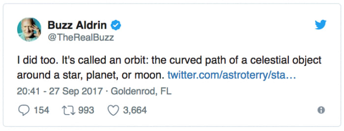 ▼曾經登上月球的太空人Buzz Aldrin表示:「我也是,有個東西叫做軌道,恆星、行星、月球都會沿著這條彎曲的路徑運行。」