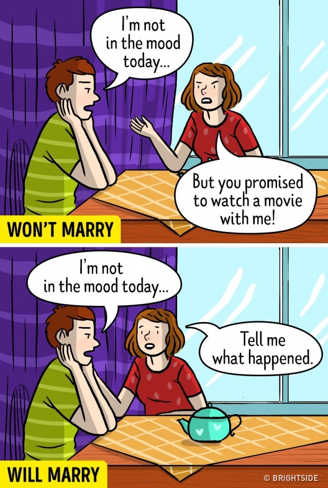 不會娶:男:我今天沒心情出門...女:可是你今天答應我要陪我看電影耶!