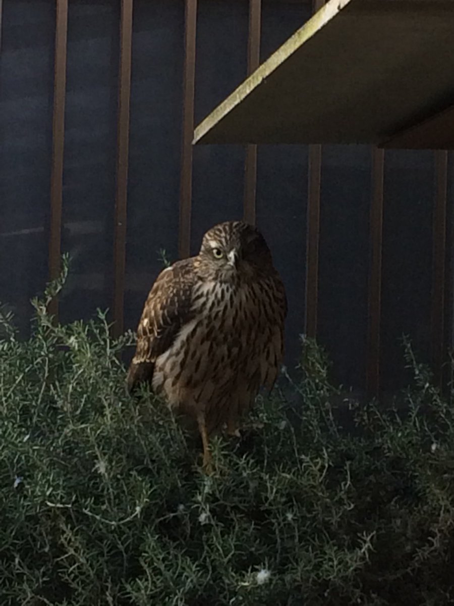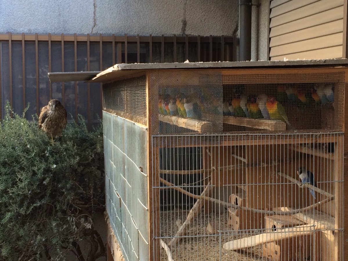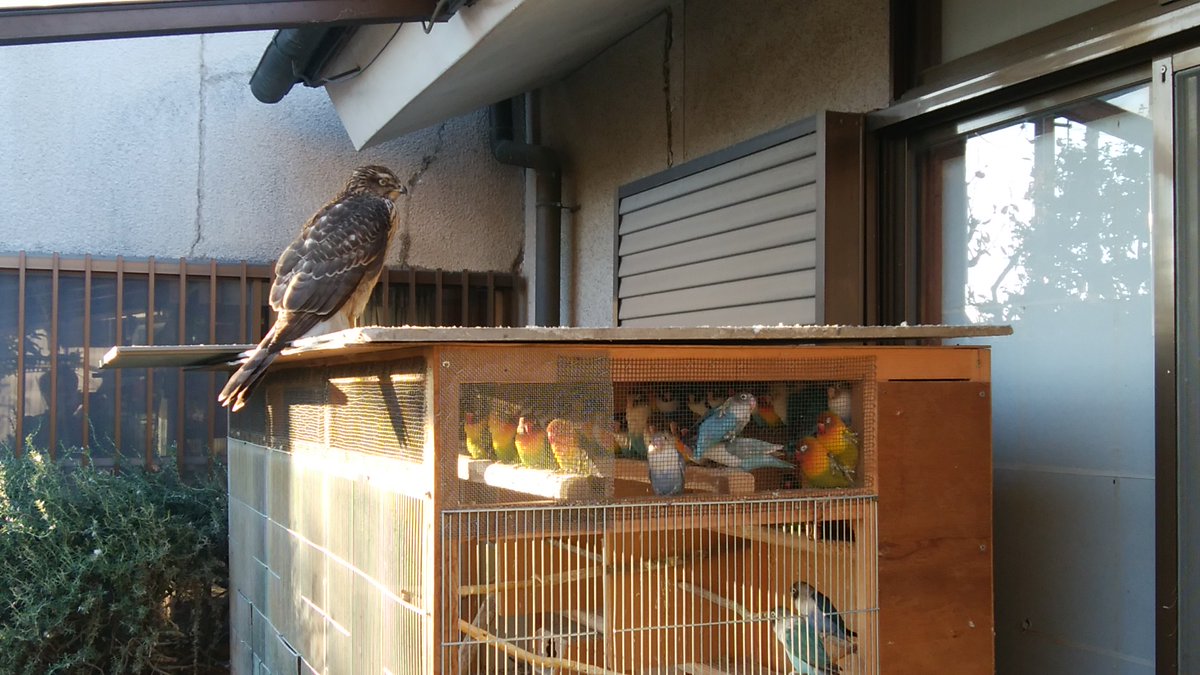 ▼一隻大黑鷹降落在院子裡,就停在鳥籠旁邊。平時聒噪的鳥們一個個超乖巧,站成一排不敢動,也不敢出聲。
