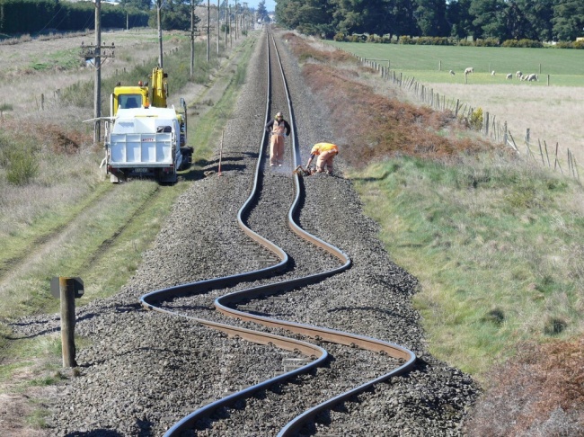 ▼紐西蘭地震後扭曲的鐵路軌道。