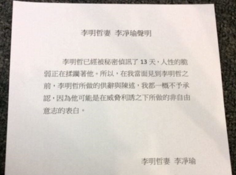 ▼李明哲被判刑後,妻子李靜瑜隨後返台,召開記者會表示:「坦然面對折磨,是人權工作者的信條,李明哲已經展開他作為人權工作者的『政治良心犯』的宣揚,希望世人持續給予關注,不要讓他被遺忘在世界的角落,持續受難。」她也提到只要李明哲還在牢裡,她就不會放棄拯救丈夫,「對於一個政治良心犯來說,即使一天都是非常非常重的刑責。」