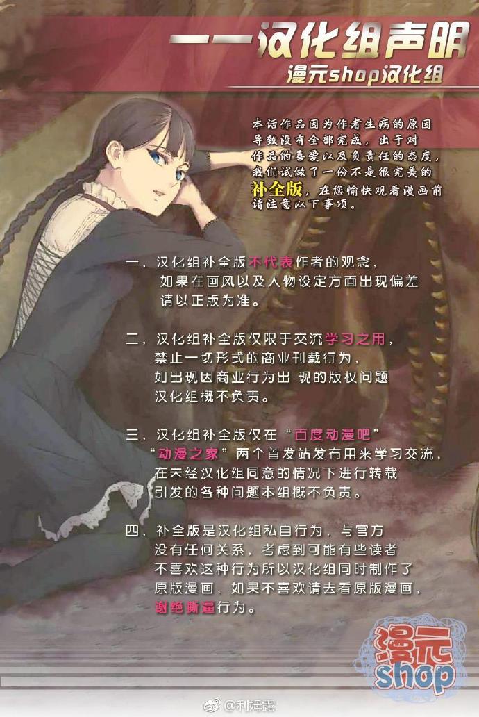 ▼這個「漢化組」在開頭就已經聲明:「本話作品因為作者生病的原因導致沒有全部完成,出於對作品的喜愛以及負責任的態度,我們試做了一份不是很完美的補全版。」
