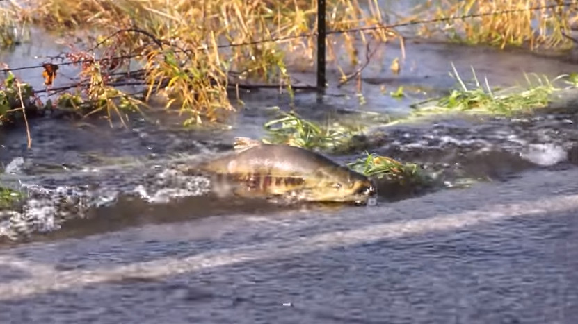 ▼原來每年的11、12月都是鮭魚的洄游季,這時也是當地降雨量特別大的時候,也使思考科密西河很容易就河水氾濫,水也漲到馬路上面。而鮭魚天生的本能可以讓牠們感知到這就是牠們回到上游最快的捷徑,於是牠們「鋌而走險」穿越馬路回到上游產卵的奇景就這樣出現了!
