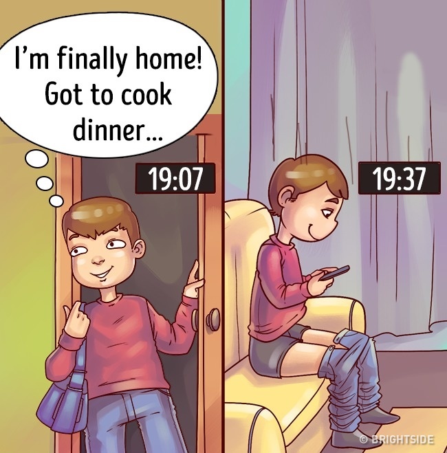 ▼前一秒計畫滿滿「終於回家了!做晚飯吧……」,下一秒褲子脫一半就開始狂玩手機。