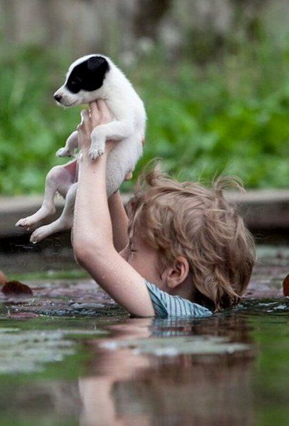 ▼一名塞爾維亞的小男孩把自己家的小狗舉國頭頂穿過深水。