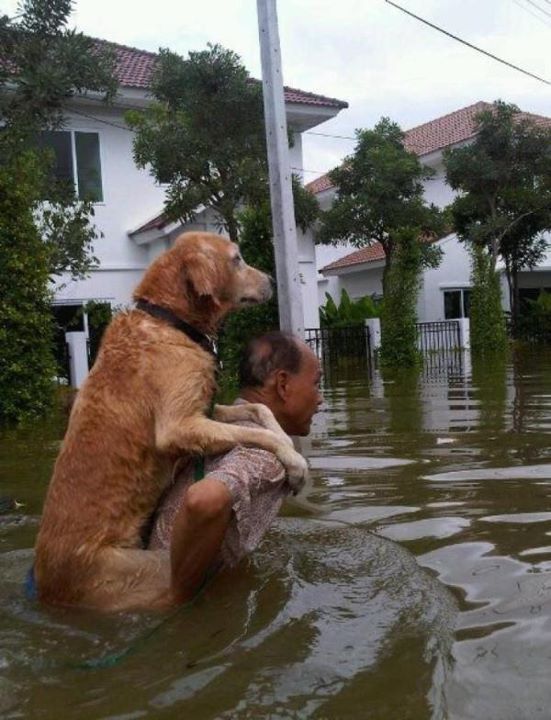 ▼主人背起愛犬逃離洪水。