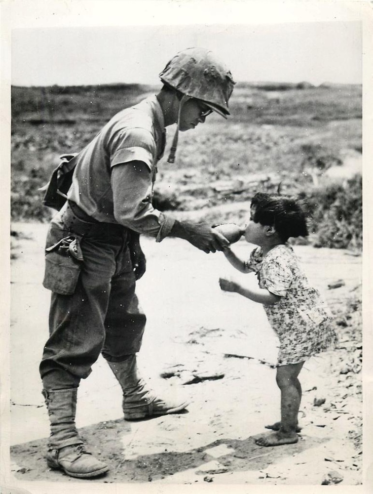 ▼1945年一名美國海軍陸戰隊隊員發現山洞裡的日本小女孩,並給她餵了水。