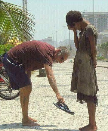▼老人把自己的鞋子給了一位貧窮的赤腳貧民。