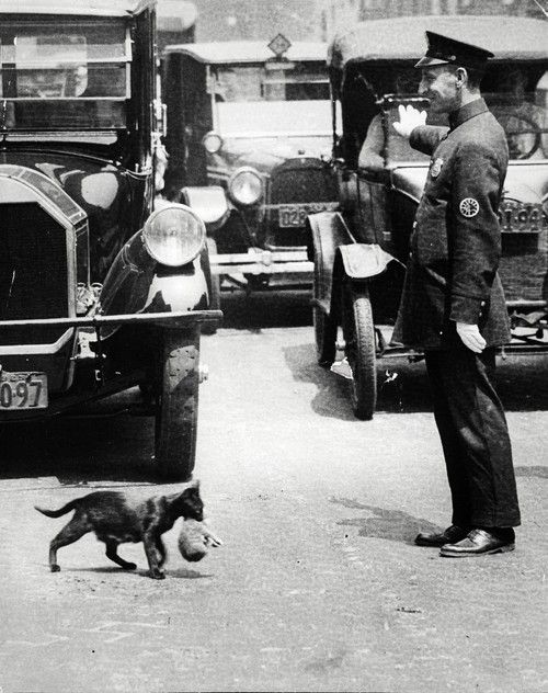 ▼1925年攝影師拍下一名交警攔下汽車讓貓咪和貓寶寶穿越馬路。