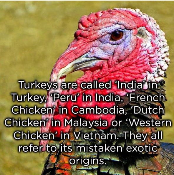 ▼1.火雞有超多來源,在土耳其說是「印度」、在印度說是「祕魯」、在柬埔寨說是「法國雞」、在馬來西亞說是「荷蘭雞」、在越南說是「西方的雞」,但實際上火雞的原始是在北美、墨西哥。(以訛傳訛世界版。)