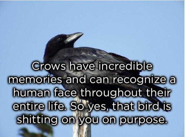 ▼20.烏鴉記憶力超好,他們也可以認得人的臉,所以如果你有惹過牠,對,牠就是故意大便在你身上的。
