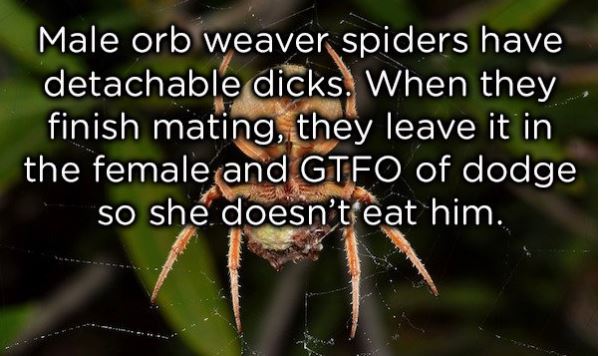 ▼6.雄性金蛛的老二可以分離,當他們結束交配的時候,他們會把小弟弟留在母蛛的體內來躲避自己被吃掉的可能。(好想知道蜘蛛是不是母系社會喔。)