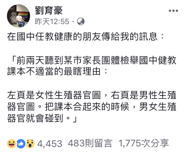 ▼最近,他在臉書上分享國中健教老師的誇張案例,有家長檢舉說健教課本兩頁分別是男女生殖器,「把課本合起來的時候,男女生殖器官就會碰到。」理由讓人直呼超瞎!