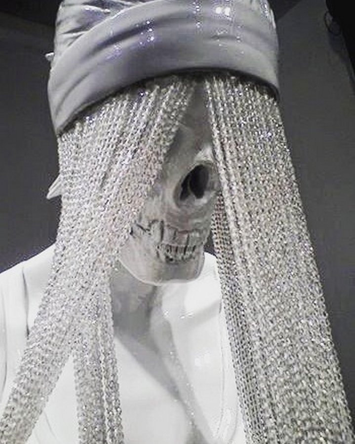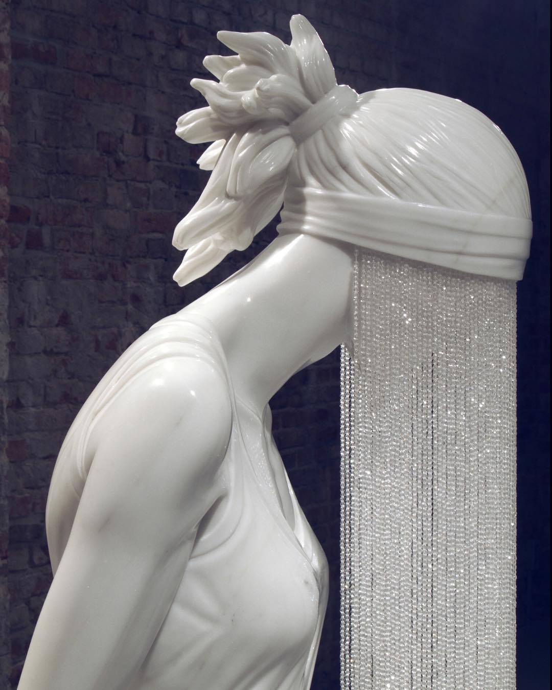 ▼這是英國藝術家Kevin Francis Gray創作的大理石雕塑「幽靈女孩」(Ghost Girl)。這座雕塑最大的特點就是臉上的玻璃珠簾,背後藏著的是只有骷髏的臉,象徵著世界的殘酷。
