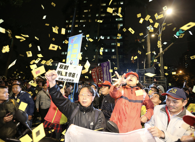 ▼這一次的《勞基法》審查過程只能用「混亂」兩個字形容,民進黨在12月4日強行將法條送交院會,引起了許多不滿的勞方群眾在立法院外抗議,痛批民進黨害得老公過勞。