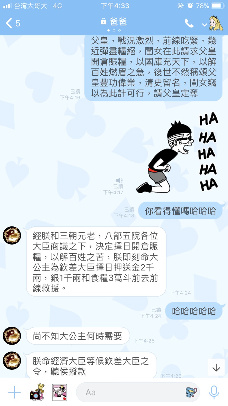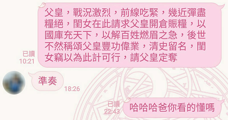 ▼她表示為了不讓爸爸覺得她每次都是想要錢,所以嘗試用其他人比較高雅地討錢方式,傳訊息寫下:「父皇,戰況激烈,前線吃緊,幾近彈盡糧絕,閨女在此請求父皇開倉賑糧,以國庫充天下,以解百姓燃眉之急,後世不然稱頌父皇豐功偉業,青史留名,閨女竊以為此計可行,請父皇定奪。」