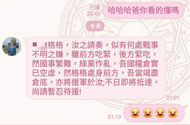 ▼老爸也很霸氣地回應:「准奏。」但她擔心老爸看不懂,又再詢問了一次,沒想到爸爸回:「格格,汝之請奏,似有何處戰事不明之嫌,雖前方吃緊,後方緊吃」,還寫說「吾國糧倉實已空虛」,但因為寶貝女兒處身前方,「吾當竭盡倉底,亦將援軍於汝;不日即將抵達,尚請暫忍待援!」