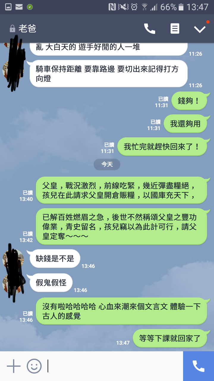 ▼只是當另外一位男大生嘗試同樣方法時,沒想到卻被老爸一語點破:「缺錢是不是?假鬼假怪。」讓他趕緊回:「沒有啦哈哈哈哈,心血來潮來個文言文,體驗一下古人的感覺。」