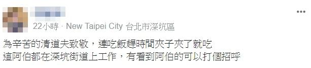 雖然伯伯拿來吃飯的夾子似乎是「垃圾夾」,但其他網友完全沒有嫌髒,留言說:「噢天啊,北北怎麼穿這麼單薄」、「不知道為什麼看了覺得心好酸喔…」、「我如果是他小孩我一定很心疼」、「天氣冷,希望他保重身體」、「要惜福,路上看到掃地的,舉牌的,辛苦了一天不知有沒有800塊」、「看到這個就想到 之前有一個亂丟垃圾的被清道夫勸導,亂丟垃圾的回『我不亂丟你會有工作?』傻眼…」清道夫真的很偉大,感謝他們的付出!