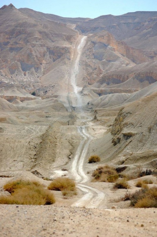 ▼以色列內蓋夫沙漠中的公路,近乎直立的坡度。