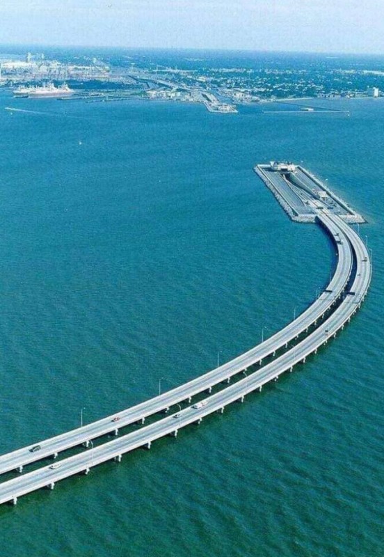 ▼被稱為現代世界七大工程奇蹟之一的切薩皮克灣隧橋,總廠37公里,在急速行駛中穿越海底。