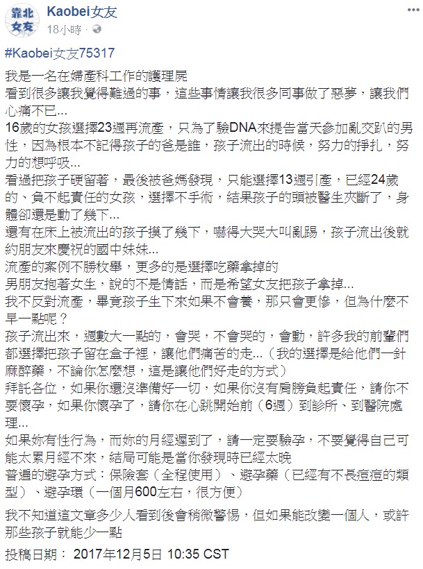 2017年12月12日前幾天,一名在護產科工作的護理師在臉書「靠北女友」發文,講述了自己的見聞。她表示自己不反對人工流產,但必須提醒大家,這種事越早越好,否則對小孩會造成很大的傷害。
