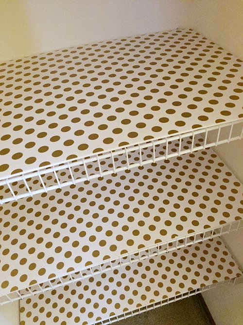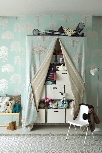 ▼櫃子太雜亂的話,就用和壁紙類似的布蓋一下。