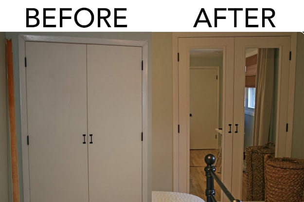 ▼在衣櫃門板上貼鏡子。